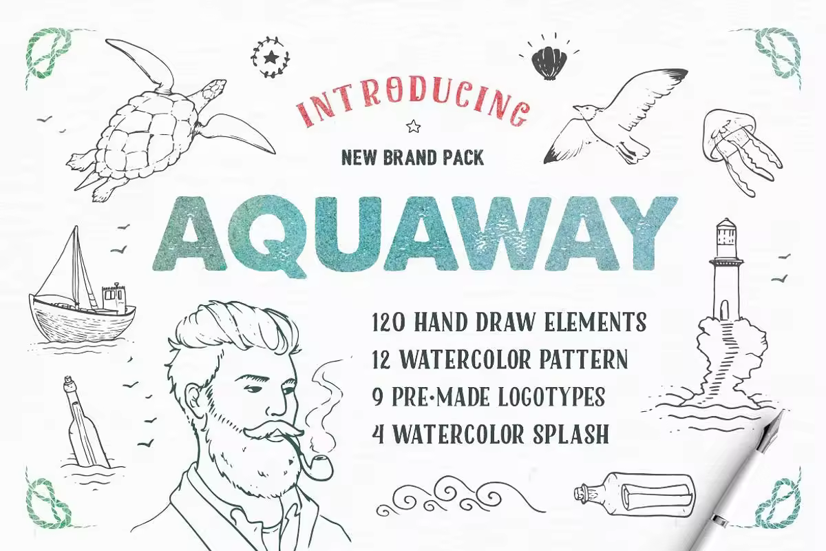 海洋主题水彩矢量插图设计套装 AquaWay — watercolored vector pack 手绘插画 8.8k+ OHM。 素材清单: 120个手绘元素 12个水彩图案(pat) 9个预先制作的复古徽标 4个水彩飞溅效果 文件包括:EPS, AI, PSD, JPG, PAT
