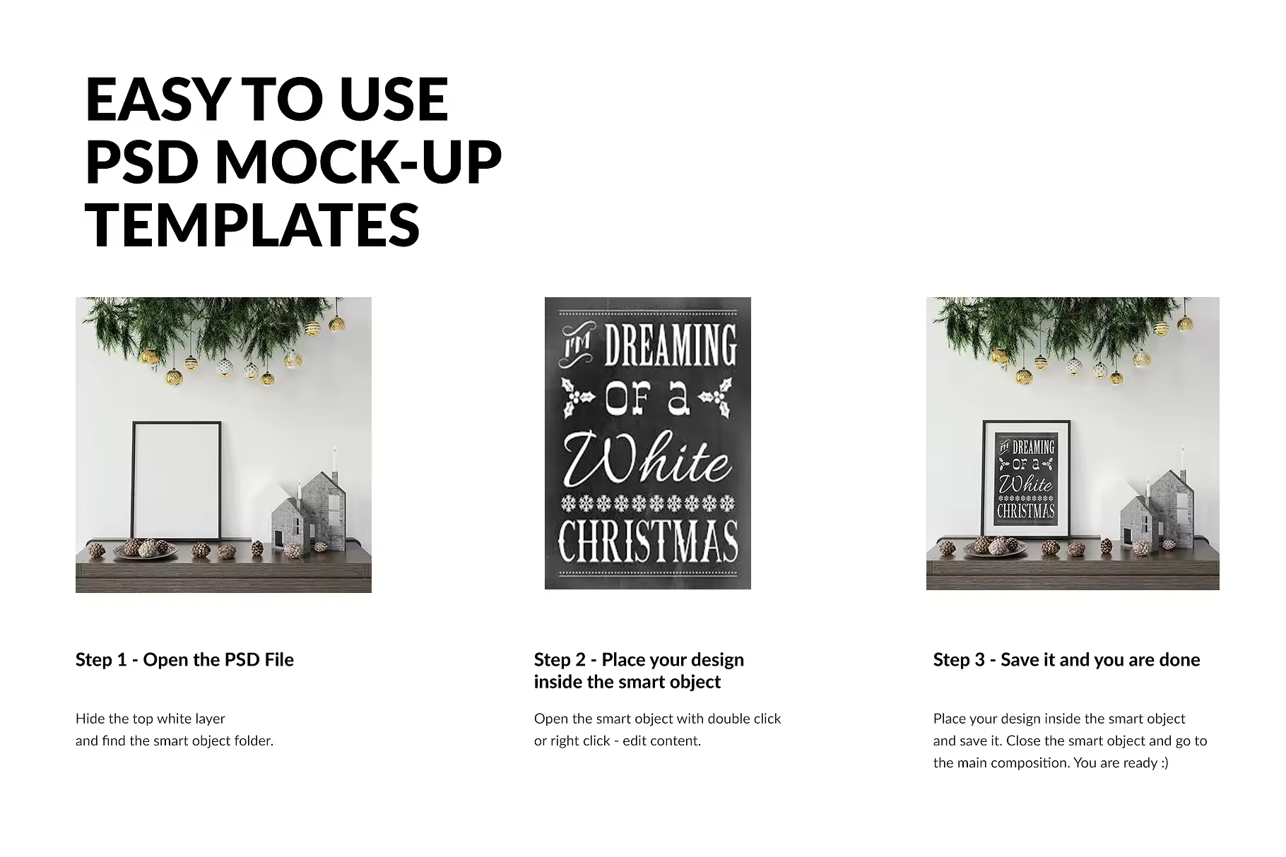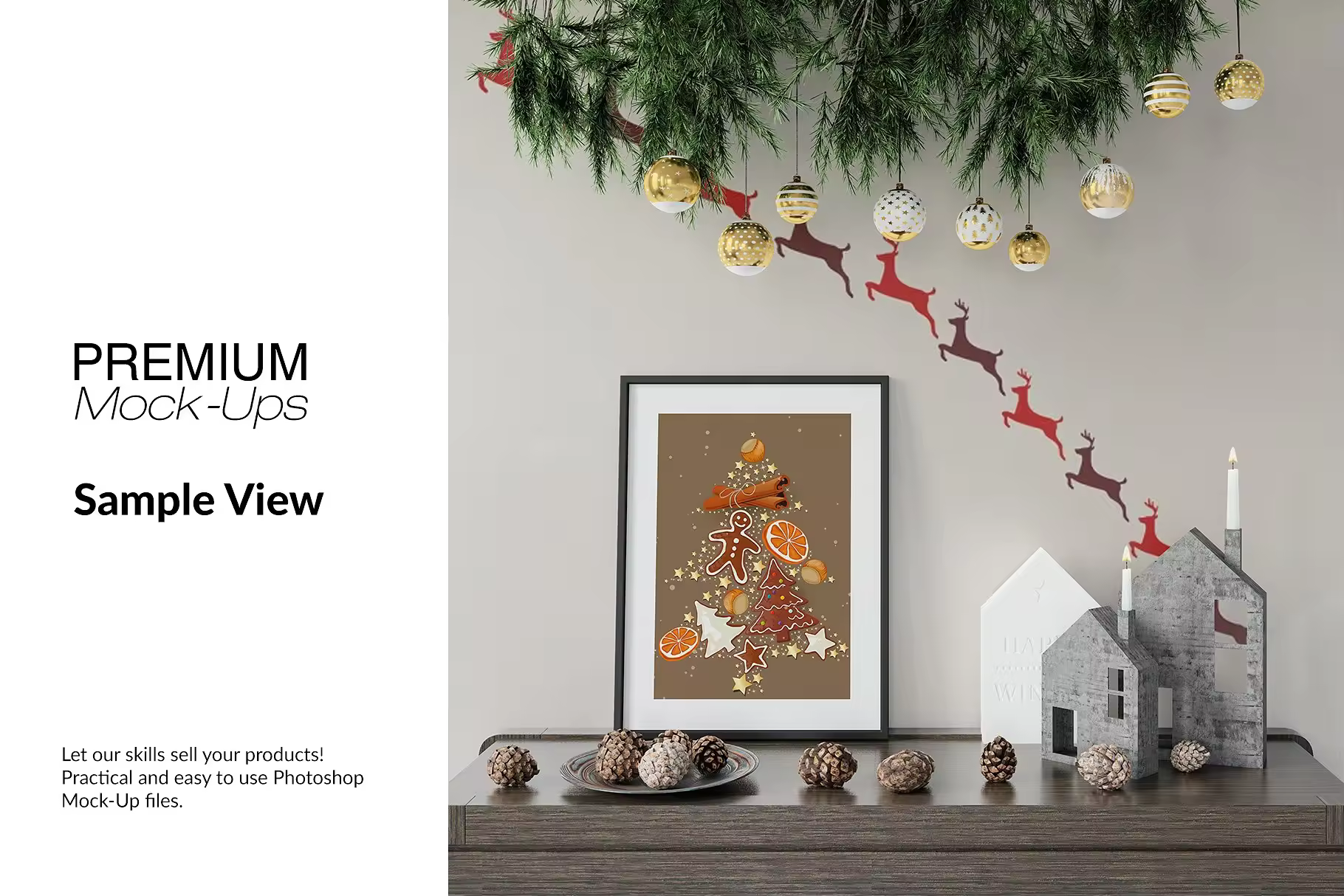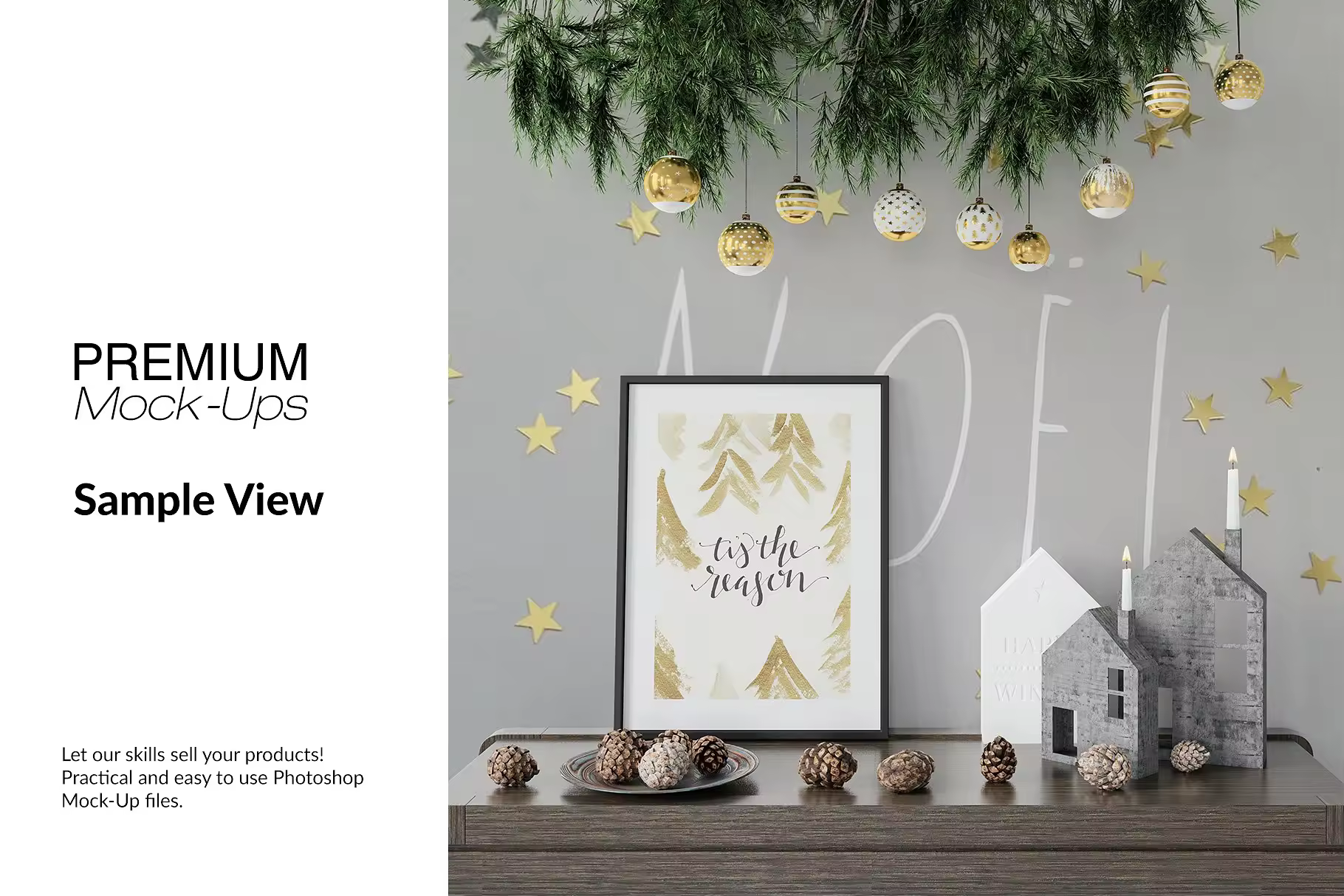 今天分享的是,高品质的圣诞节画框框架和墙壁装饰展示样机,能帮助您快速显示您的设计和布局到一个真实的数码照片,enjoy!