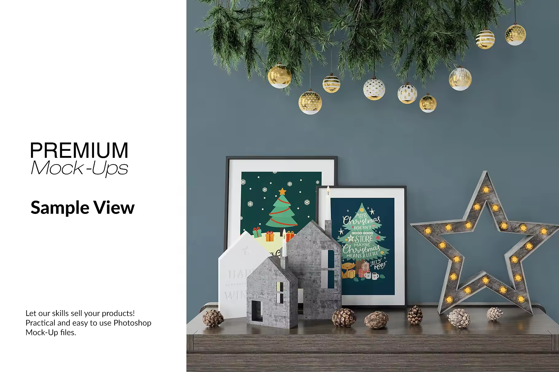 高品质的圣诞节画框框架和墙壁装饰展示样机 Christmas Frames & Wall Set [psd,jpg]