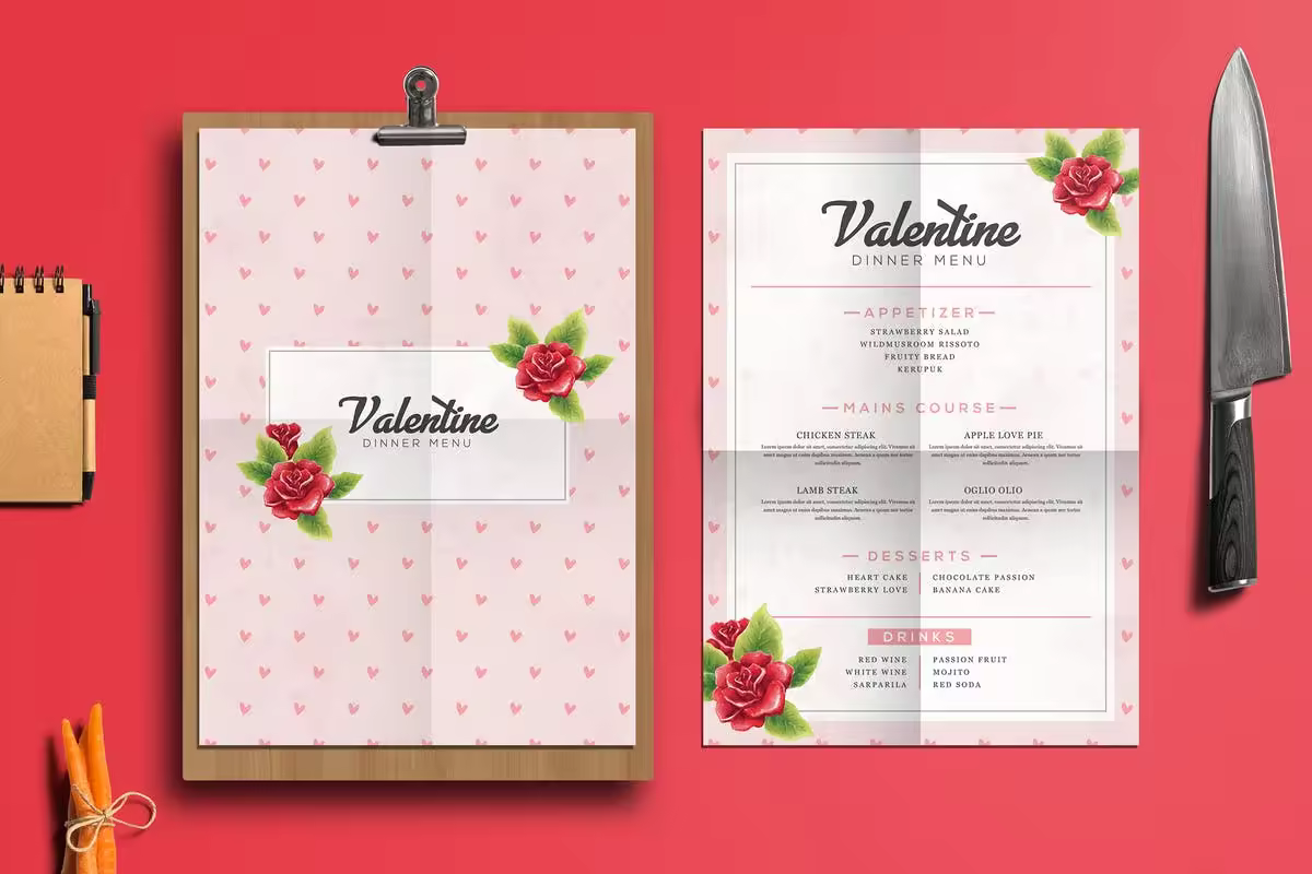 情人节主题餐厅菜单设计模板 Valentine Food Menu 菜单模板 2.5k+ OHM。 素材特点: Ai CS6和PSD文件 21×29.7厘米+出血线 100%矢量格式 组织良好的图层 完全可编辑的 CMYK,300 DPI