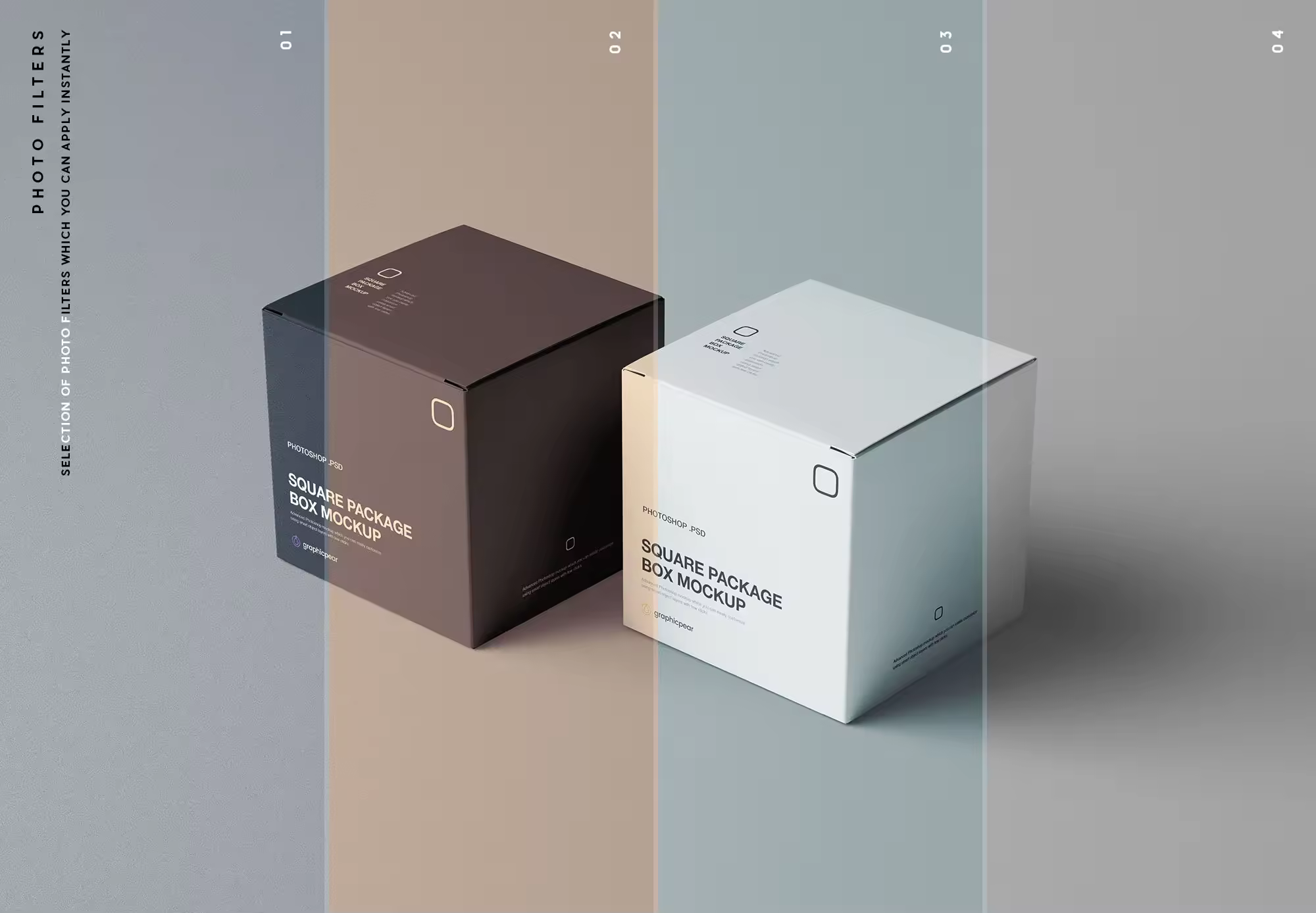 方形包装盒设计效果图样机模板 Square Package Box Mockup 包装样机 12.8k+ OHM。 这组合集包括了7款方块视图模板,将以专业逼真的方式预览您的设计作品。您可以使用智能对象来定制这个模板。