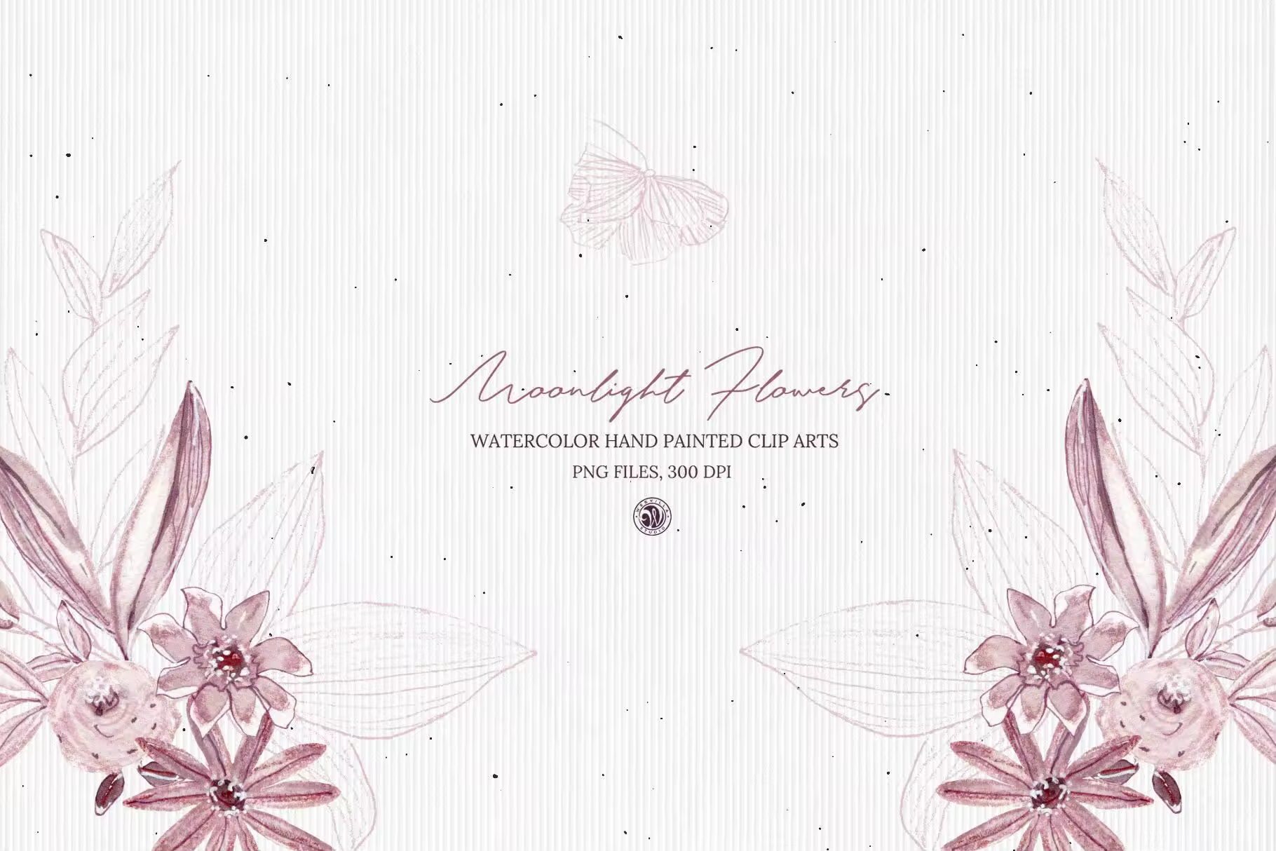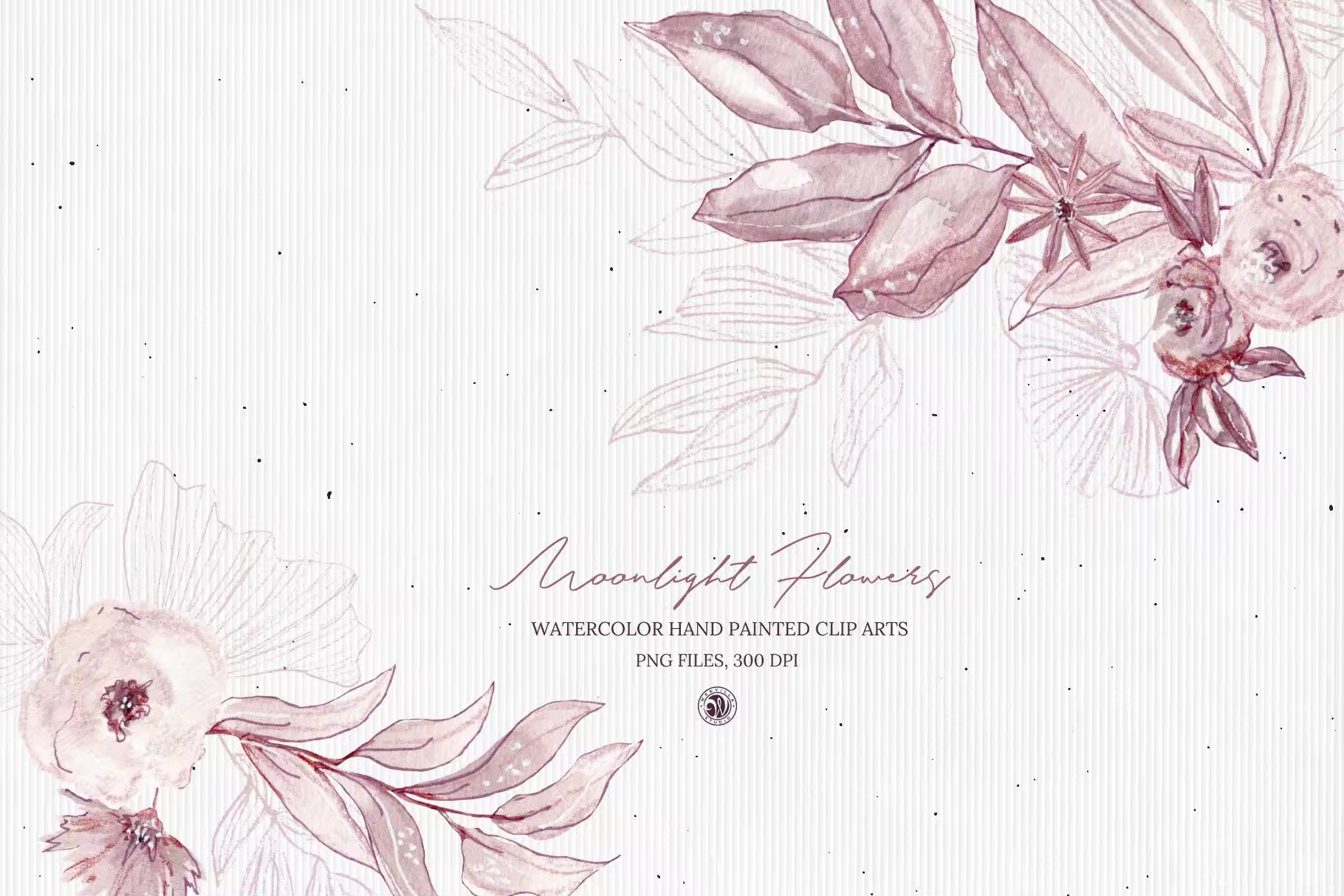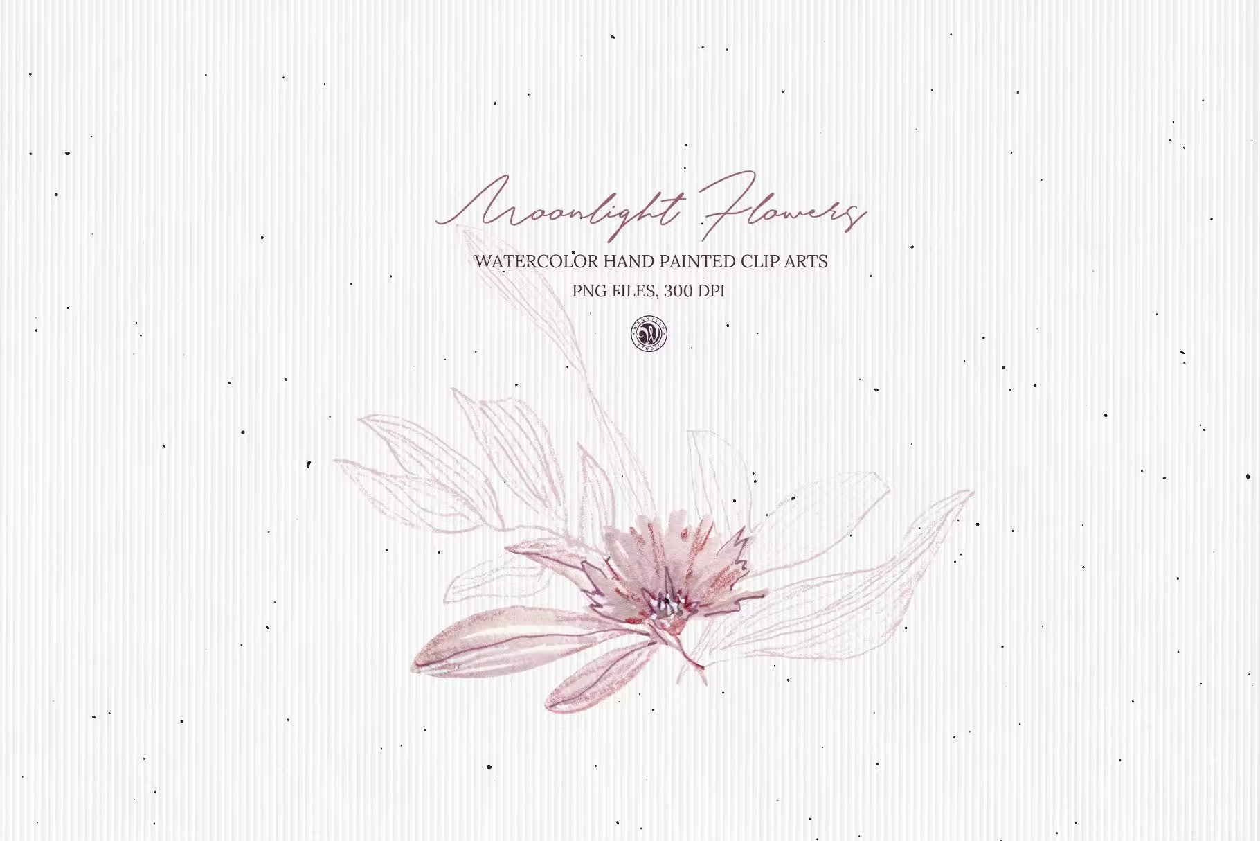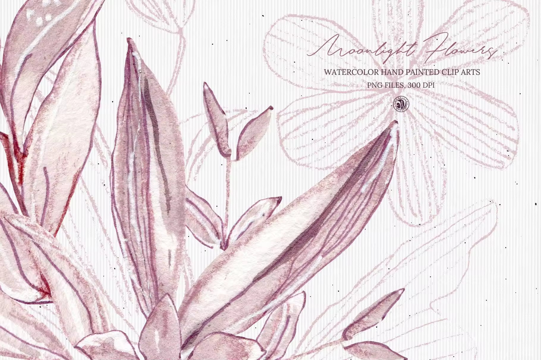 月光下的花朵,手绘水彩花卉剪贴画。非常适合邀请函、名片、品牌、Instagram、手工工艺品、印刷纸制品等。所有文件均为PNG格式,具有透明背景和300 dpi分辨率。非常适合与任何编辑程序一起使用。