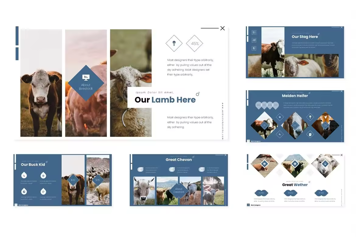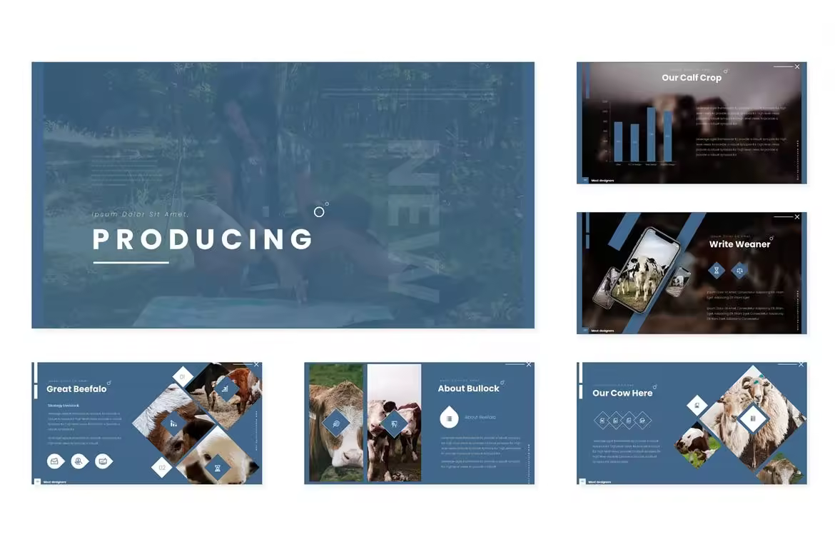 养殖业/牧场宣传谷歌幻灯片设计模板 Producing – Google Slides Template Slides模板 2k+ OHM。 素材特点: 150+总幻灯片,5个预先制作的颜色 每个模板30张 5个色彩变化 基于主幻灯片 像素级的插图 所有图形可调整大小和编辑 包含图片占位符,可拖放