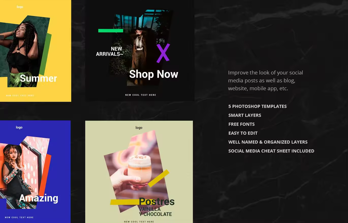 使用此素材改善您的社交媒体页面以及博客、网站或移动应用程序的外观。该素材包括5个为Instagram设计的模板,还包括针对不同社交媒体帖子大小的文件。每个都易于编辑和自定义。