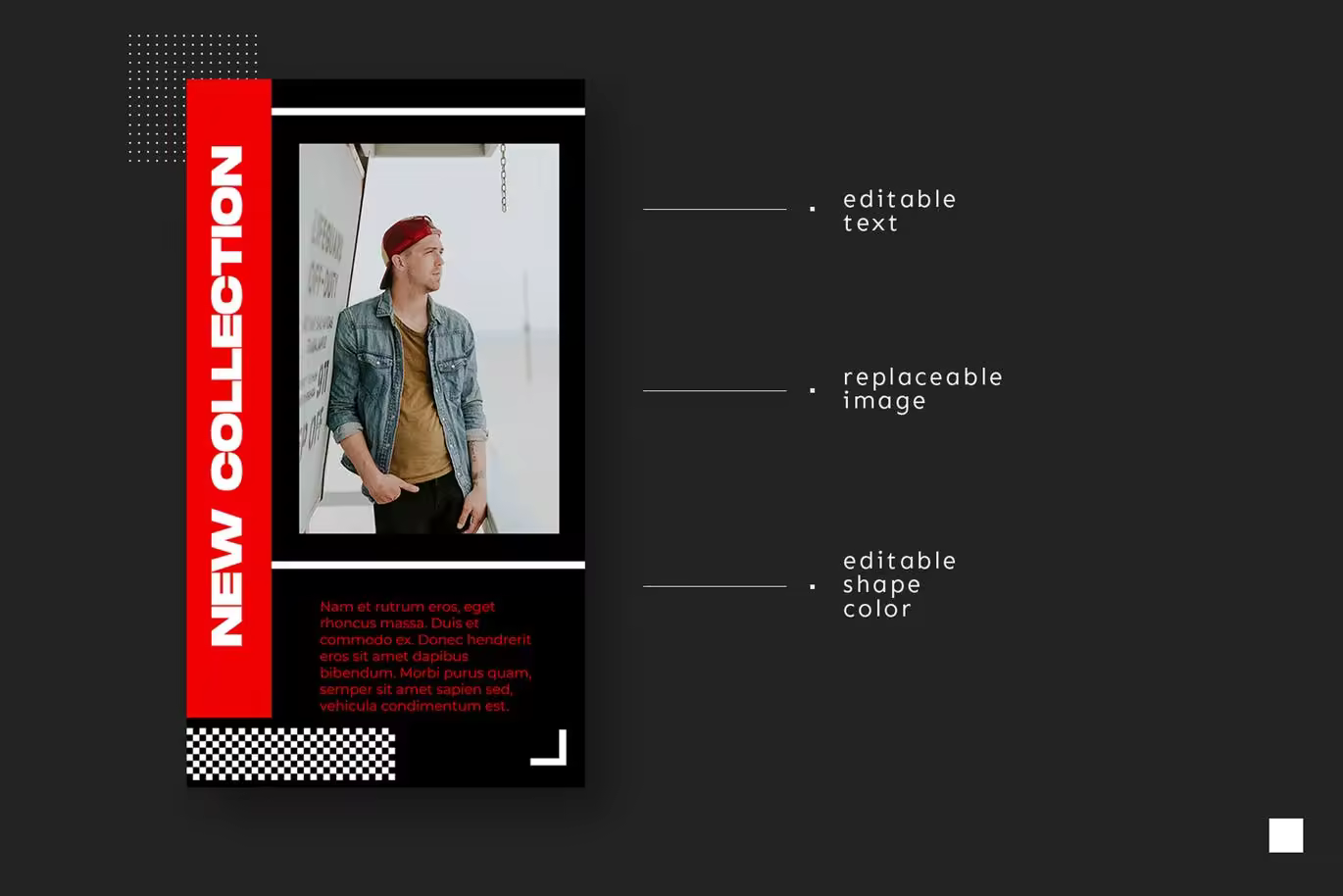 这个创意和现代的红黑配色风格Instagram社交品牌故事设计模板是100%可在PhotoShop中编辑的。满足你的推广需求。
