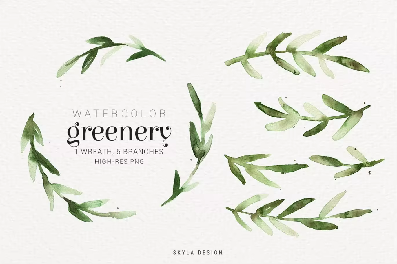 绿色水彩手绘枝叶图案PNG素材 Watercolor greenery 手绘插画 2.5k+ Eva_Lee 华丽的水彩分支和花圈。 这些在结婚请柬,卡片和徽标上看起来很可爱。 您将收到6个300 dpi的高分辨率单个PNG文件,透明背景,1个花圈和5个分支