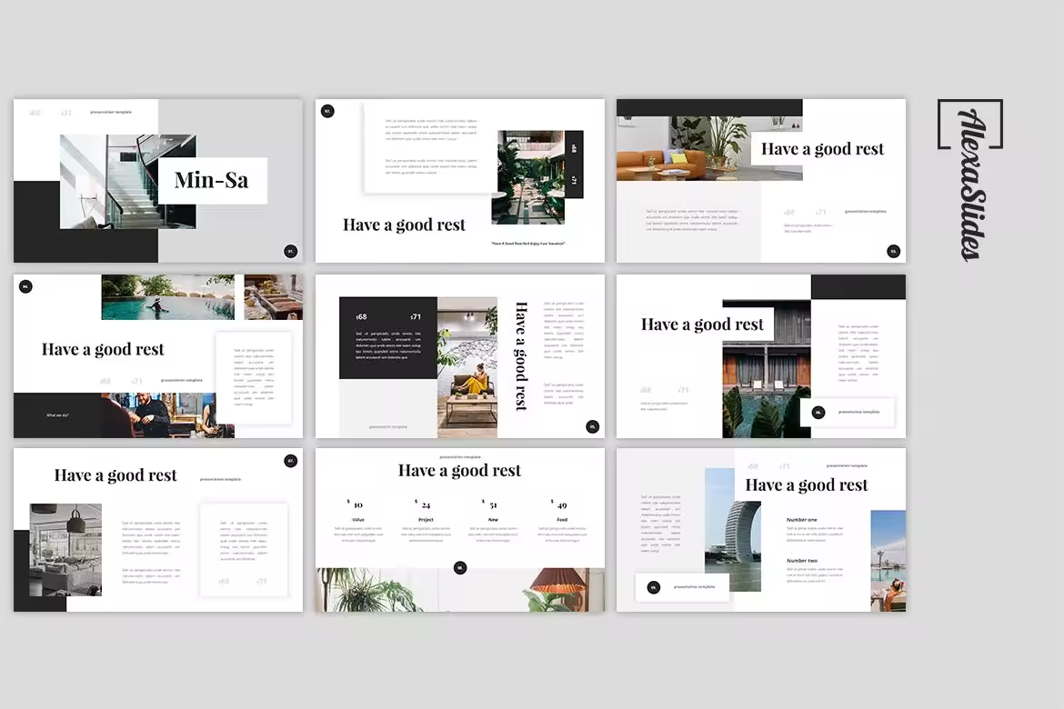 简约概念酒店服务介绍幻灯片PPT模板 MinSa – Hotel Powerpoint Template PPT模板 3k+ OHM。 素材特点: 包括30张创意幻灯片 基于主幻灯片的现代布局 矢量图标 100%完全可编辑 纵横比16:9 注:不包括预览图片。