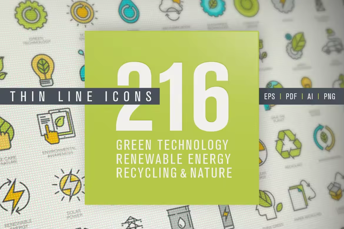 - 216个细线设计风格图标,代表绿色技术、可再生能源、循环利用、环境、自然
