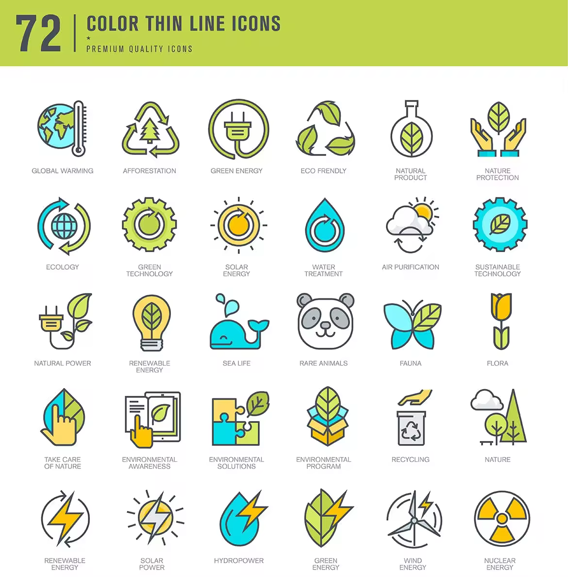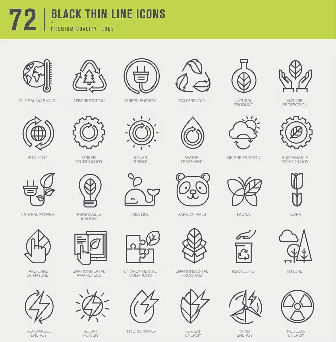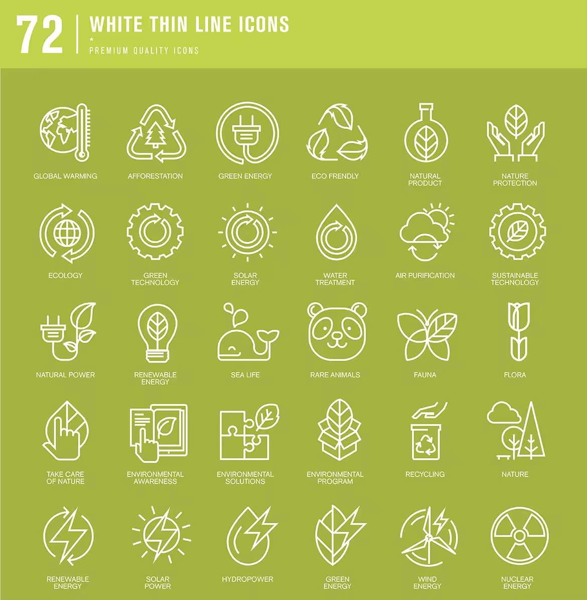 这是一组集绿色科技、可再生能源、循环利用、环境、自然、生态为一体的现代细线图标合集,该套件可用于多种用途,如:网站、打印模板、演示模板、宣传材料、信息图形、网络和移动电话服务以及应用程序。