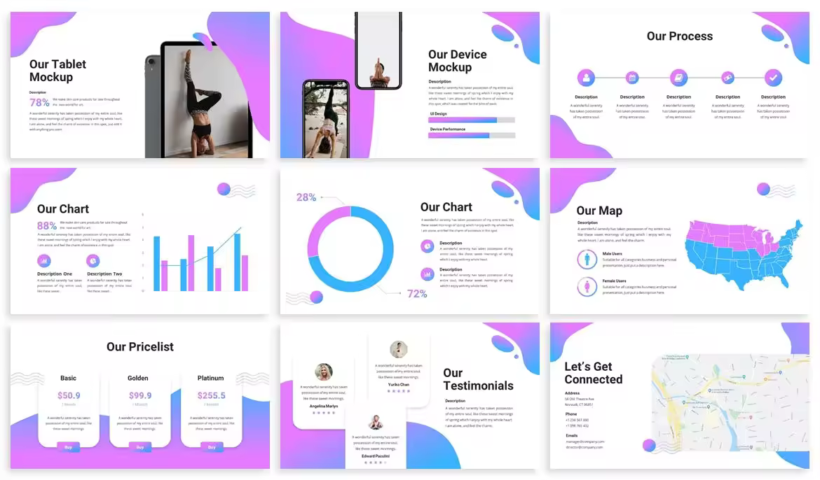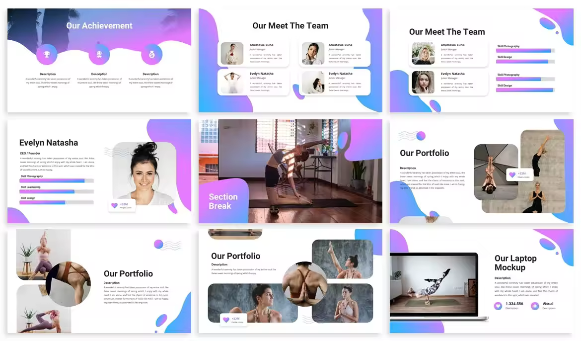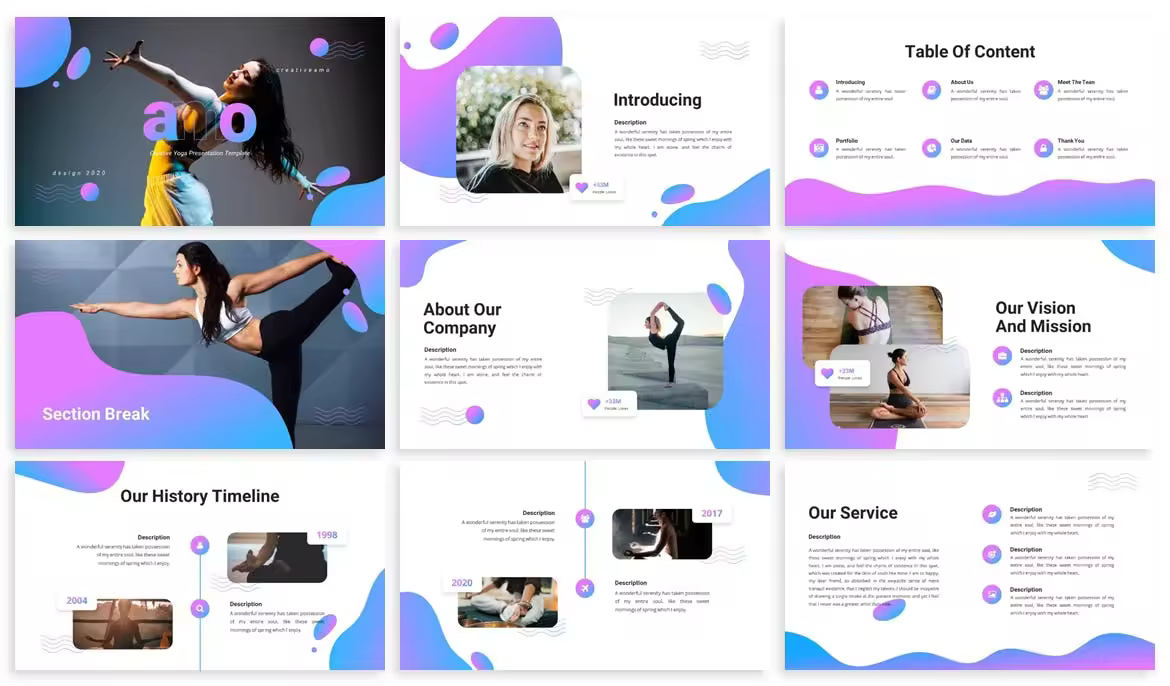 瑜伽机构课程推广PPT课件模板 Amo – Yoga Presentation Template PPT模板 6.5k+ OHM。 Sphera是一款风格简单、干净的演示模板,适用于瑜伽、冥想、运动、商务等活动。 素材特点: 20个文件:pptx, PPT & KEY 5个预先制作的颜色主题:绿色,橙色,粉色,紫色和红色 明暗背景设计 可拖放图片到Powerpoint和Keynote